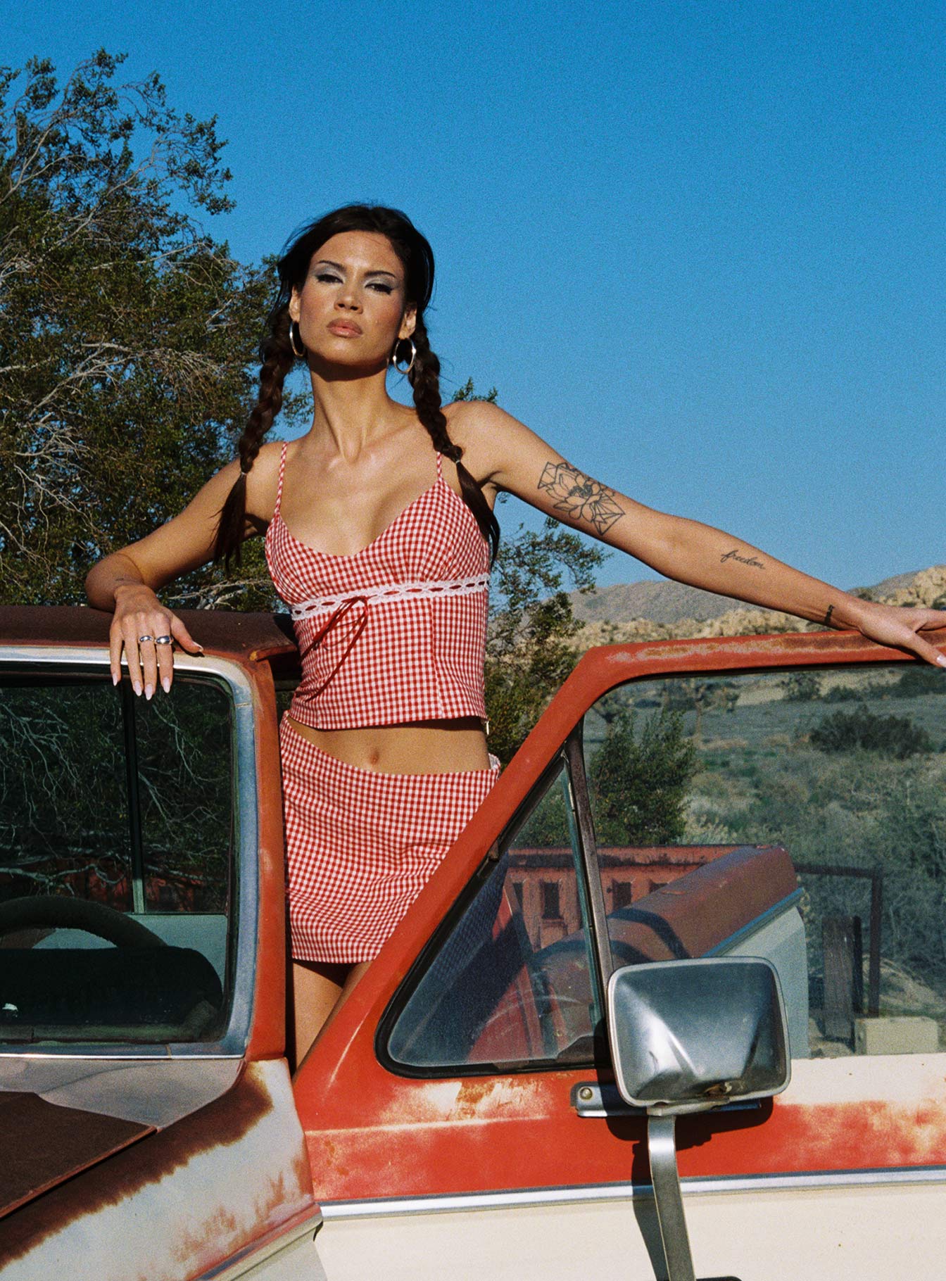 • Gingham print, v neckline, adjustable straps, lace detail, invisible zip fastening